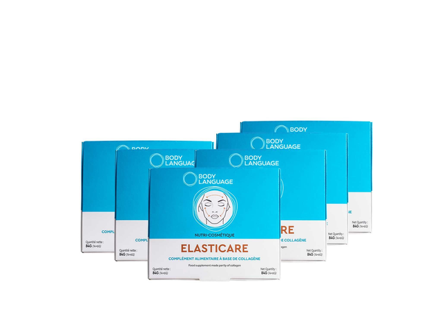 Combat les signes du vieillissement de l'intérieur en un geste simple chaque matin ! Elasticare réunit les anti-âge essentiels pour une peau visiblement plus ferme et élastique. Ce complément alimentaire intègre l'ingrédient anti-âge par excellence : le collagène hydrolysé de poisson. Le collagène, synthétisé naturellement par le corps, est la protéine responsable de la fermeté de la peau. A partir de 25 ans, sa production diminue et les signes de vieillissement apparaissent. ELASTICARE améliore le taux d'hydratation de la peau, améliore la souplesse de la peau, stimule la production de collagène, renforce le derme et soutient la récupération des tissus conjonctifs et articulaire.